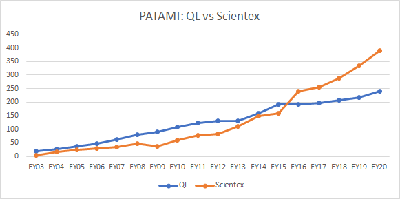 While QL's revenue is always higher than Scientex, we can see that from FY2016, Scientex's profit after tax and minority interest (PATAMI) has surpassed QL and goes from strength to strength from there.