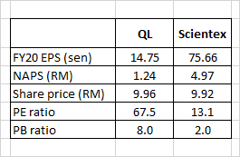 If Scientex is to be given a PE of 67 like QL, it will be worth RM50.