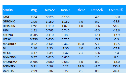 I didn't buy and sell a lot in 2022. Besides MI, I added LEESK into my portfolio, top up more JHM & Krono's shares and traded LTKM.
